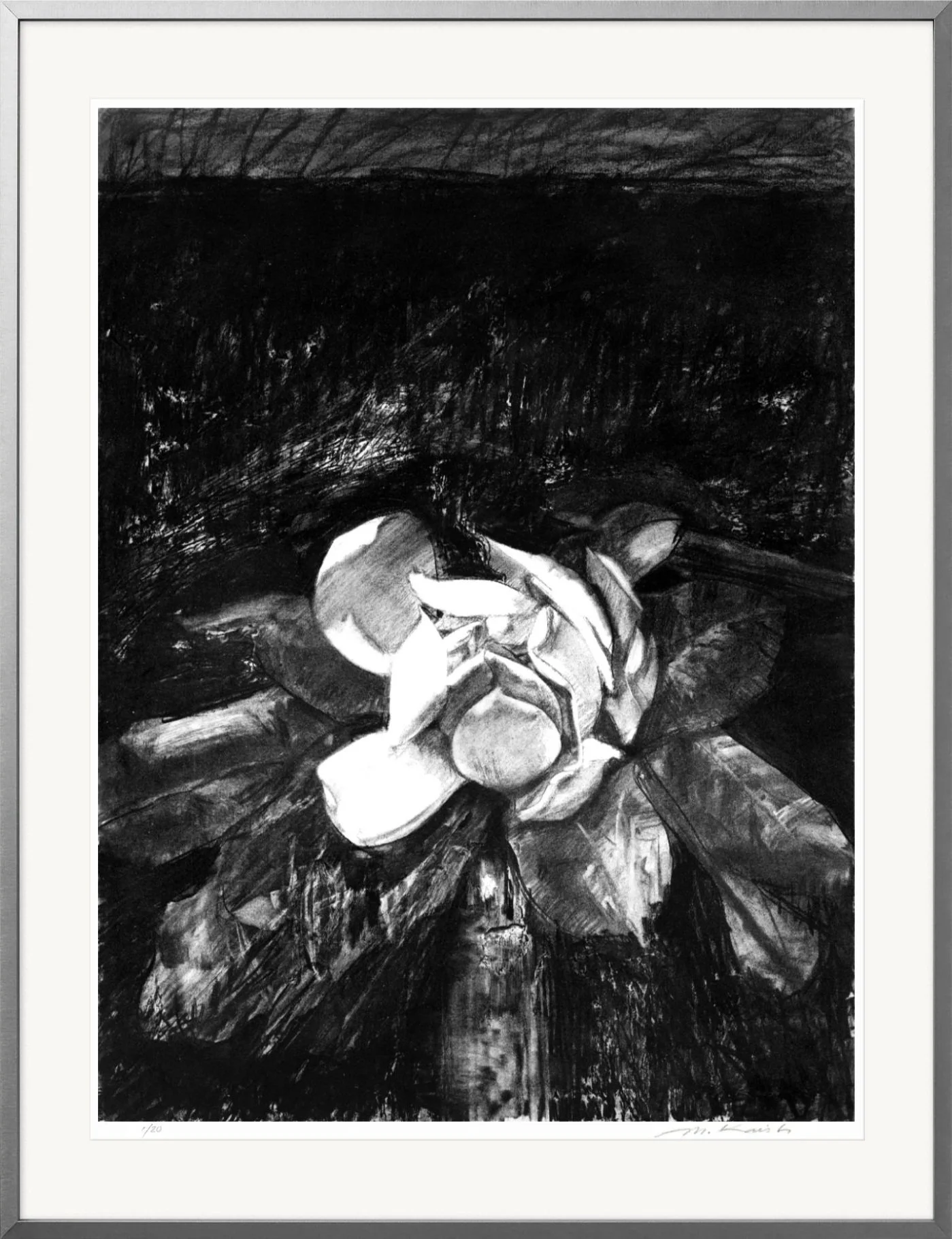 “North of San Francisco, in Marin, the magnolias grow huge and white unlike anything I’ve ever seen. One summer, I made a series of three charcoal drawings of cut blooms set under a brilliant overhead skylight. I thought of them as ‘Rembrandtesque’ flower portraits, the glowing petals emerging from the mysterious shadows. Finding them exciting images for gravure etchings with drypoint and aquatint added, I created a limited-edition.”